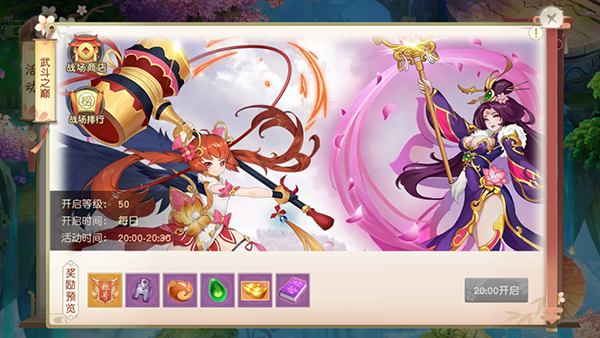 武斗之巅每天都可以参与,活动时间是20:00至20:30,只需要达到50级就进入战场了。武斗之巅一共十层,每层击杀一定人数即可进入下一层,所以进去后什么都不要说,直接放大招就是干!