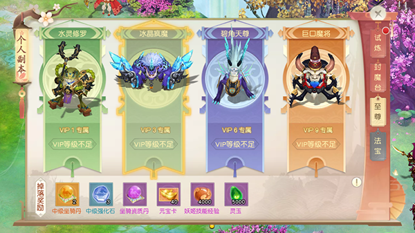个人副本分别分为、试炼、封魔台、至尊BOSS三大类。