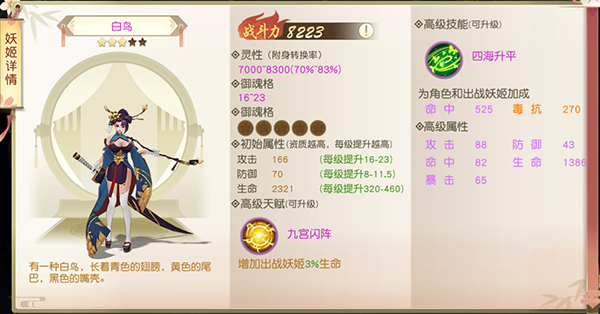 白鸟可以通过唤妖获得,其原始战力达到8223点。